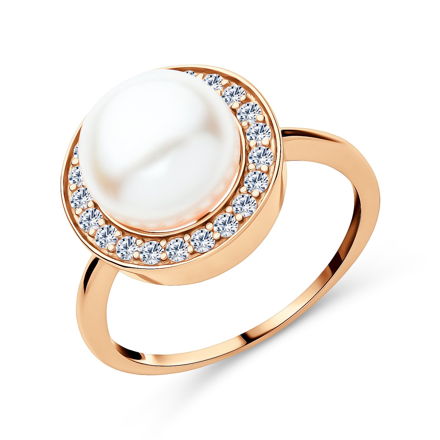 Серебряное кольцо с жемчугом и фианитами и позолотой