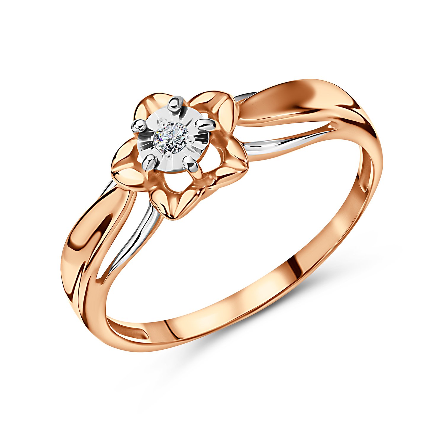 Золотое кольцо с бриллиантом и алмазной гранью с родированием