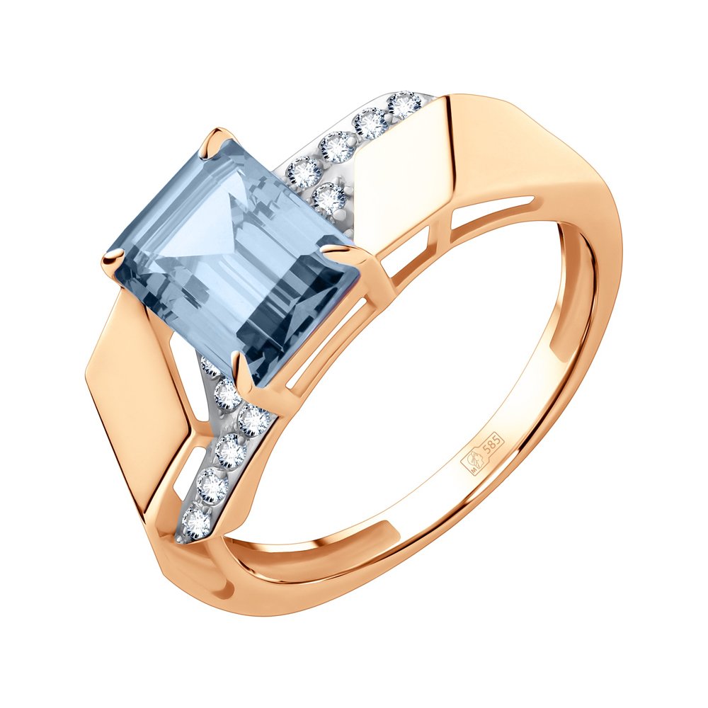 Золотое кольцо с топазом Sky и фианитами с родированием