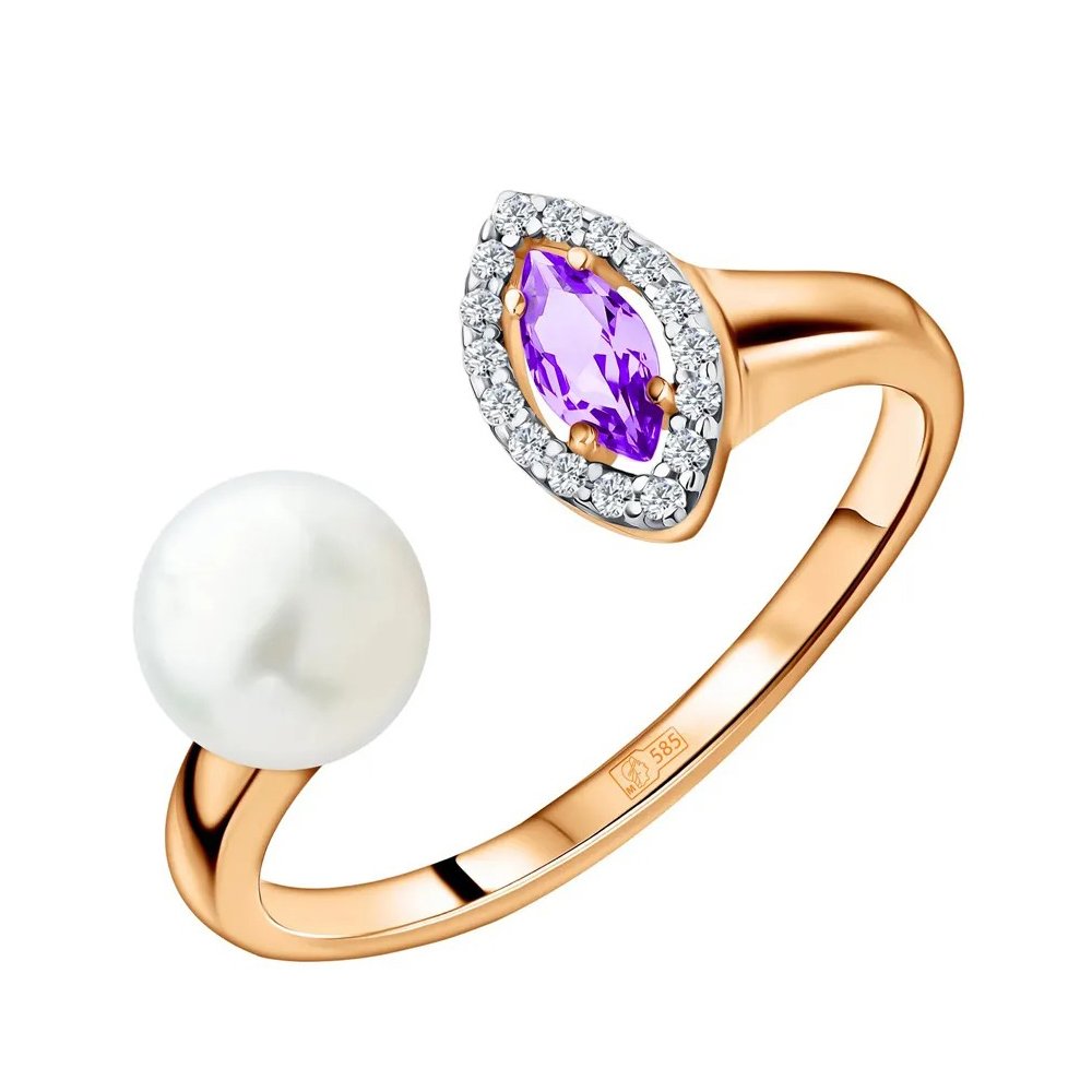 Золотое кольцо с жемчугом и аметистом с фианитами и родированием