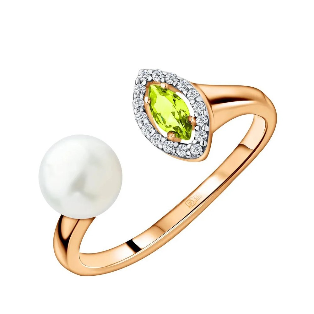 Золотое кольцо с жемчугом и хризолитом с фианитами